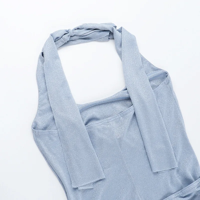 The Tula Halter Maxi Dress is your go-to for unforgettable nights and elevated elegance. Crafted in a shimmering stretch fabric with a body-hugging silhouette, it features a sultry halter neckline, open back, and a flattering front knot that enhances your curves. The thigh-high slit adds just the right amount of drama.